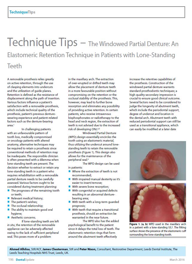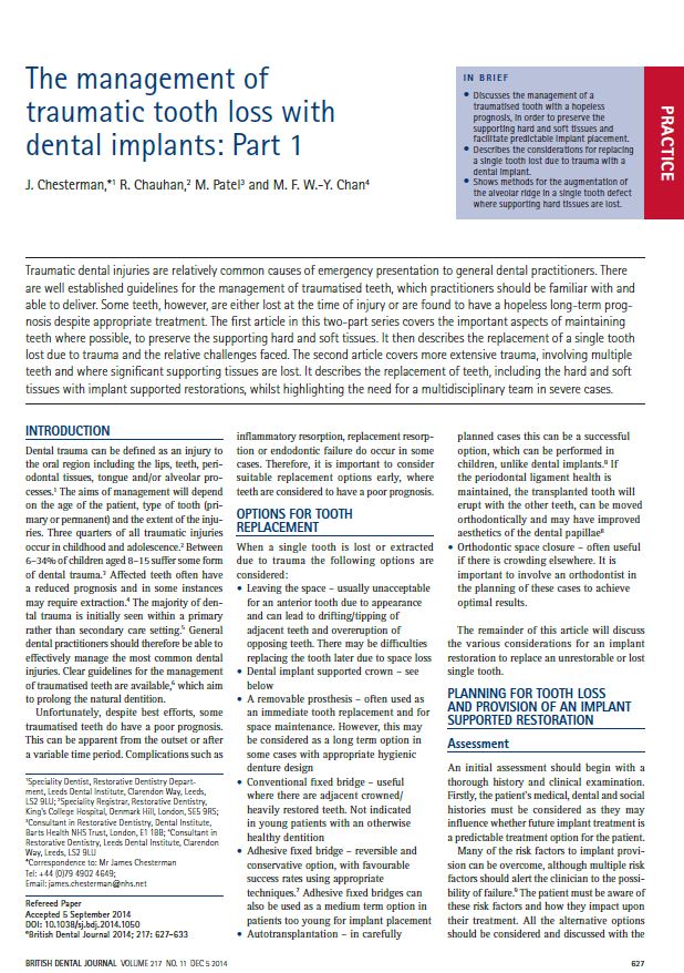 The acquired anterior open bite: Possible Aetiologies and management Strategies. 2023 Does periodontal treatment improve rheumatoid arthritis disease activity? A systematic review. 2022 Should we be screening for and treating periodontal disease in individuals who are at risk of rheumatoid arthritis? 2021 Use of xenograft bone block for staged ridge augmentation prior to dental implant placement in trauma patients. Faculty Dental Journal. 2020. Management of Enamel Defects: A case report of identical twins with enamel defects of the permanent dentition. Dental Update. 2017 Gingival overgrowth: Part 1: aetiology and clinical diagnosis. British Dental Journal. 2017. Gingival overgrowth: Part 2: Management strategies. British Dental Journal. 2017. Bulk-fill resin-based composite restorative materials: a review. British Dental Journal. 2017. Technique tips – The window partial denture: An elastomeric retention technique in patients with lone standing teeth. Dental Update. 2016. The management of traumatic tooth loss with dental implants: Part 1. 2014. Seven-year outcome data of autogenous block onlay bone grafts used to augment the alveolar ridge prior to implant rehabilitation. Implant Dentistry Today. 2014. Poster presentations at national and international conferences Titanium-Reinforced High-Density PTFE membranes in guided bone regeneration: A case series. 2016. Management of Molar-Incisal Hypomineralisation (MIH): a case report of identical twins with MIH. 2016. The acquired anterior openbite: A case series. 2016. The use of the Dahl Concept in implant dentistry. 2017. Use of xenograft blocks to augment the deficient alveolar ridge prior to implant placement in trauma patients. 2017 Hemisection of a mandibular molar with a periodontal-endodontic lesion. A Case report. 2017. Long span resin bonded bridges. 2020. Patient reported outcome and experience measures following periodontal surgery. 2020. Like Loading...