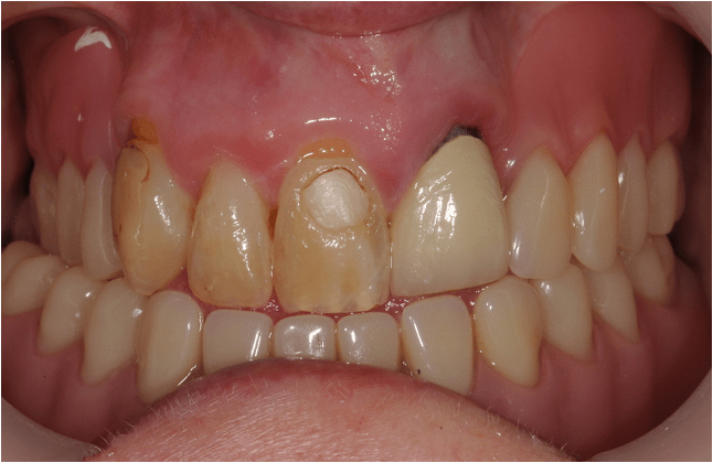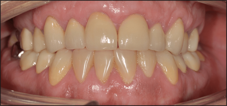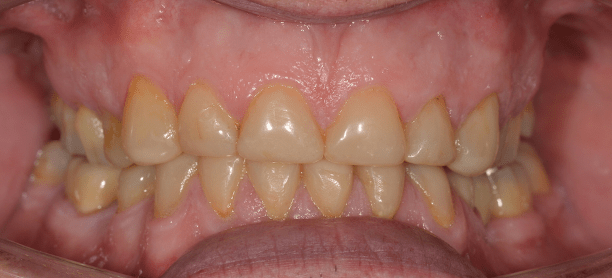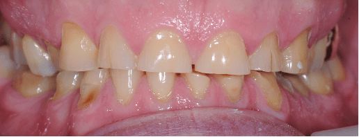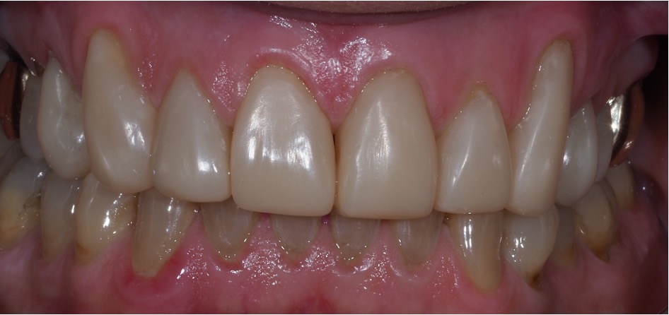 Crowns may be used to treat toothwear or broken down teeth. They are often selected where composite has failed, the teeth are too broken down or there is a need to provide a stronger material. This case was managed with surgical crown lengthening and multiple crowns. The lower incisors were treated with composite.